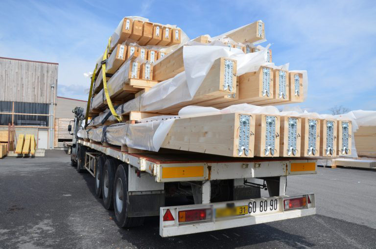 Le chargement des transports est optimisé de manière à répondre aux exigences de l’ordre de pose sur le site de destination. Quand vos constructions ossature bois quittent nos locaux, elles sont prêtes à être levées sur le chantier par nos levageurs partenaires afin de devenir un bâtiment bas carbone de qualité optimale.